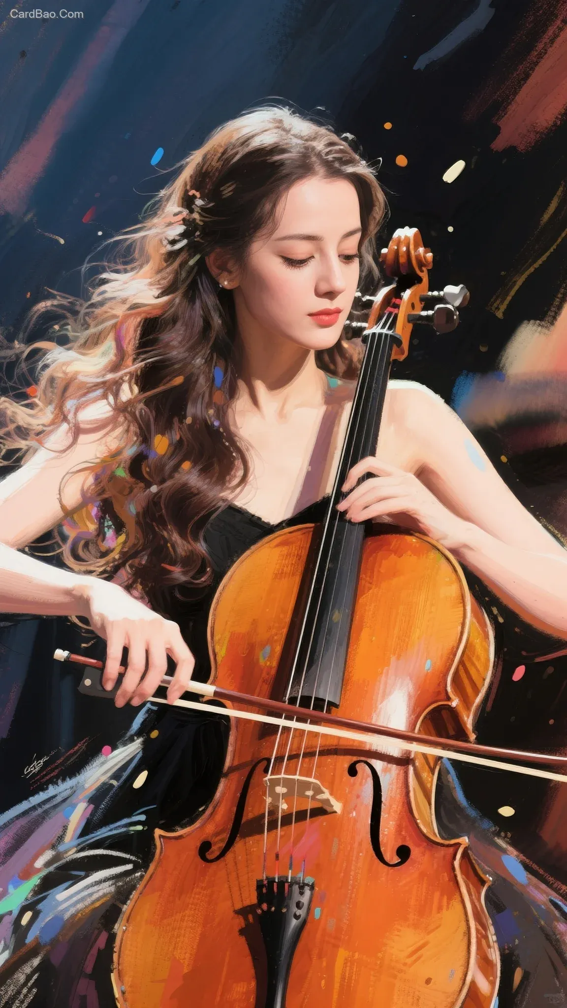 一女孩子大提琴竞技,柔软蓬松的长卷发,晕染、透叠、色域分割、动态速写、肌理表现、空气透视、分层渲染、正负形、点彩、湿画法、解剖结构、张力线条、视错觉、渐变融合,热巴
