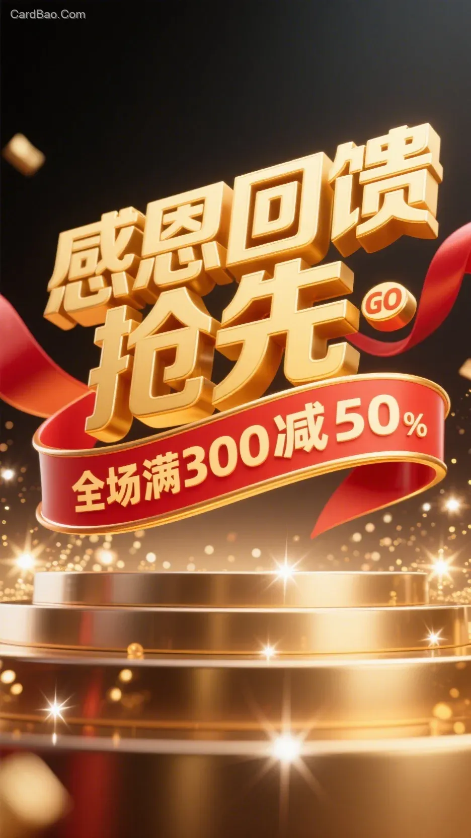 "感恩回馈 抢先 GO"金色立体标 题,3层金属材质,环绕粒子星光 特效。下方环绕红色金边的丝带, 丝带内容是"全场满300 减 50", 文字采用渐变金色描边