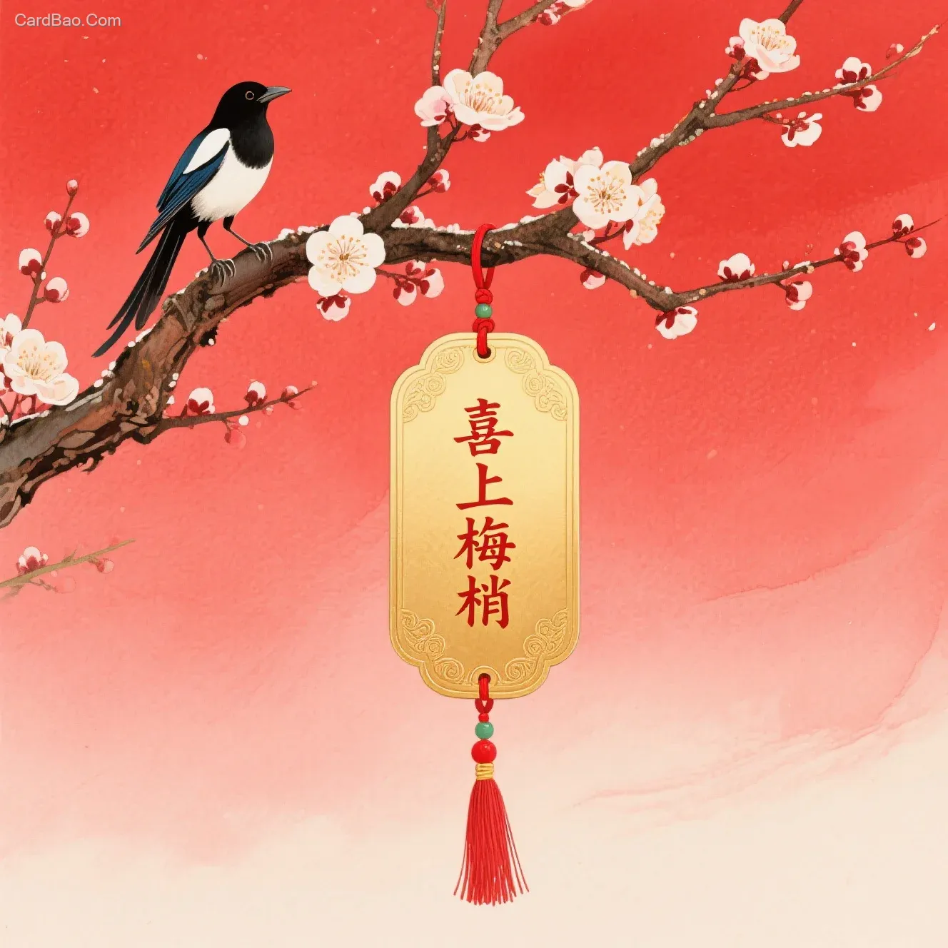 背景红色,左上角一只喜鹊站在一梅花上,中间一块很精制的国风牌子,写:喜上梅梢,金色,牌子有红绳,下面有红穗,挂在树枝上
