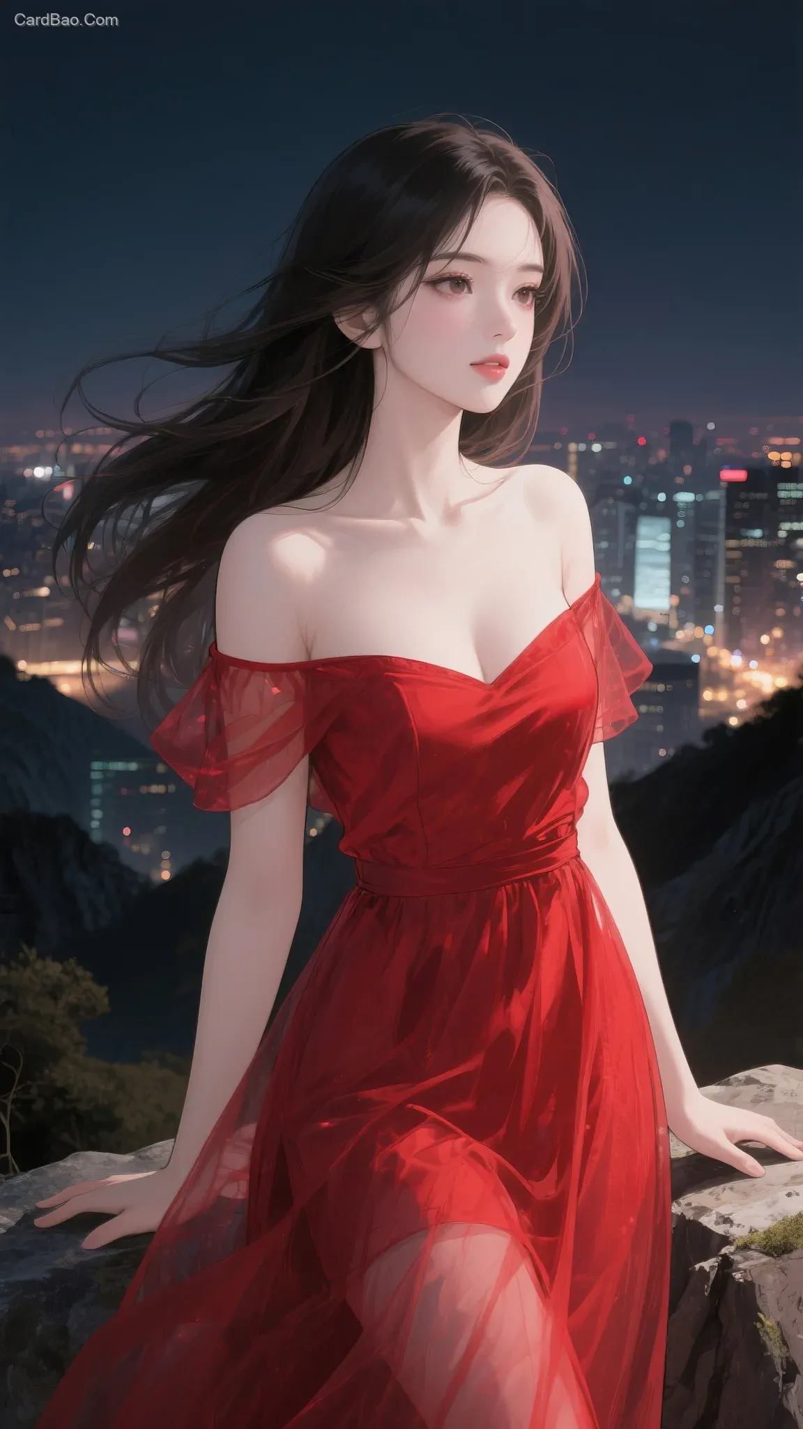 户外人像手绘漫画,仿真人,漂亮小姐姐,皮肤白暂光泽,风吹起长发飘逸,半遮朦胧不清的脸,深夜 山顶 红色性感纱裙 露出一抹香肩 在眺望城市夜景 特写,32K超高清画质,超高细节精度