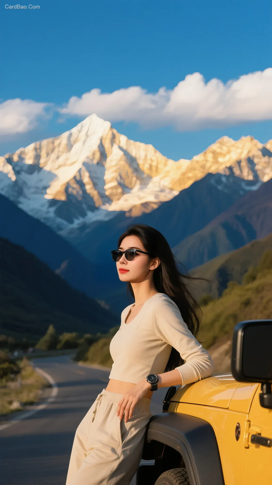 On the Sichuan-Tibet Highway, close-up: natural long hair, facial features in detail, sunglasses, light-colored casual attire, elegant figure, sports watch, leaning against an off-road vehicle;