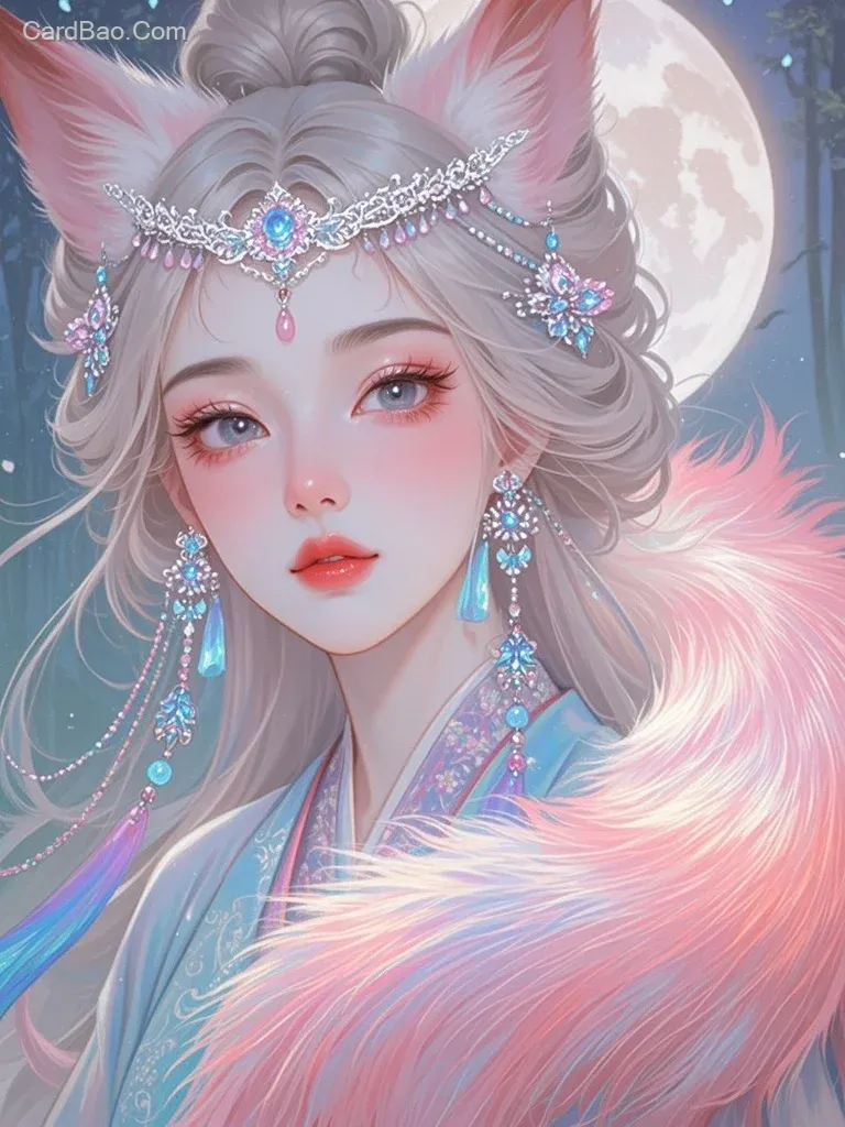 九尾狐美人 半身脸部特写 美艳 妖孽 高雅 冷 梦幻的尾巴,青丘粉色九尾狐,流苏装饰,饰品点缀,32K极致高清,炫丽厚涂,插画风,漫画风格,彩铅画,浅色系
