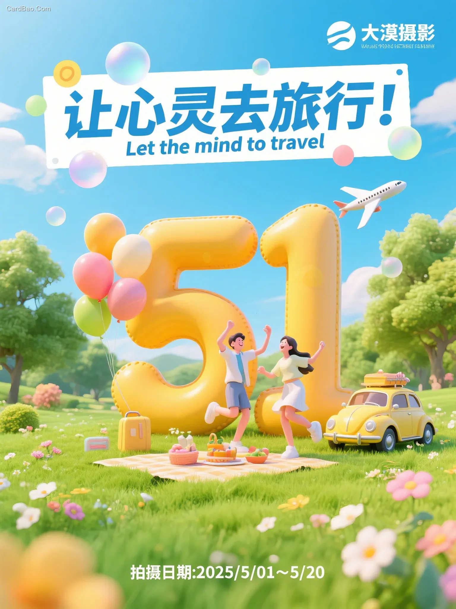 这是一张旅行社设计的宣传海报,整体风格活泼鲜艳,充满夏日气息。右上角标注“大漠摄影”。核心大标题“让心灵去旅行!”下方配有英文“Letthe mind to travel”全部大写大标题有一个立体的标签背景,标题文字上装饰着气泡等活跃氛围的装饰设计,传递出夏季出游、放松心灵的主题。画面中央是巨大的“51”造型,是气球材质,设计活泼。暗示五一假期,旁边有一架飞机和一辆黄色小车,象征便捷的出行方式:一对人物在“51”前欢快舞动和野餐,背景是绿草如茵、花朵绽放、树木葱郁的自然景观。海报底部印有“拍摄日期:2025/5/01~5/20。明快的视觉元素传递出活力与向往自由