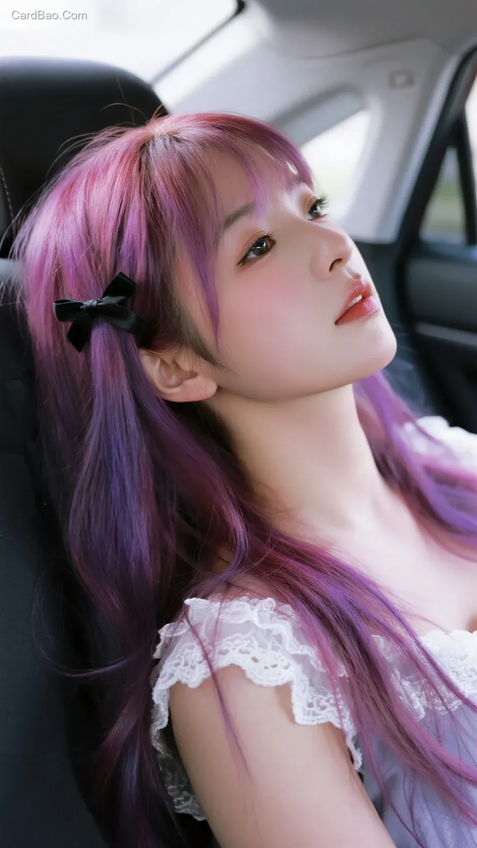 A girl lazily leans against the car seat, her long purple-pink gradient hair cascading naturally, adorned with a small black ribbon accessory. She wears a garment featuring lace and ruffled designs, showcasing a unique style. Her makeup is exquisite, and her expression carries a calm, detached aura, as if she is savoring this moment of leisure. Blending youthful vitality with a distinct sense of fashion, she presents an atmosphere that is both authentic and beautiful.