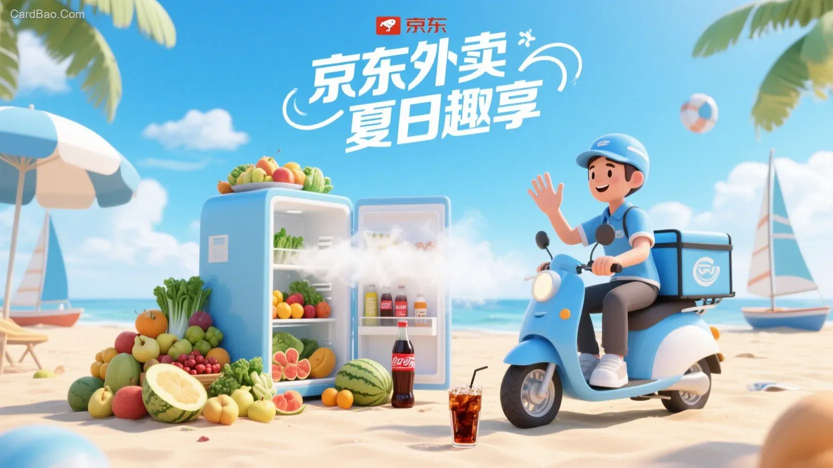 海报以蓝白色调为主,蓝天白云,充满夏日活动氛围气息,顶部写着“京东外卖,夏日趣享”以沙滩为背景,打开的冰箱里面装有蔬菜瓜果可乐等冰箱冒着冷气,冰箱周围有瓜果梨桃夏日水果,冰镇可乐冷饮,骑着外卖车的外卖员像你招手,3D渲染