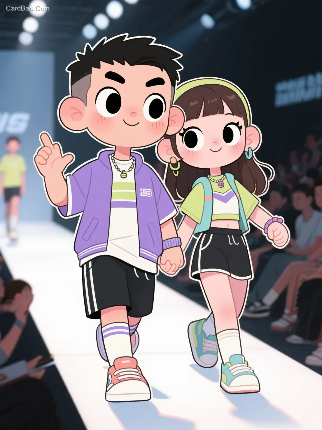 可爱甜美的情侣,手绘插画风格,平涂,半Q版,色彩柔和,造型简洁明快,漂亮的大眼,全身,搞怪,调皮,两人互动,模特T台走秀,运动主题,运动风,酷酷的,活力满满,细线勾边,漂亮合适的配饰,时尚的衣服和精致的妆容,男生阳刚帅气,粗眉,女生漂亮