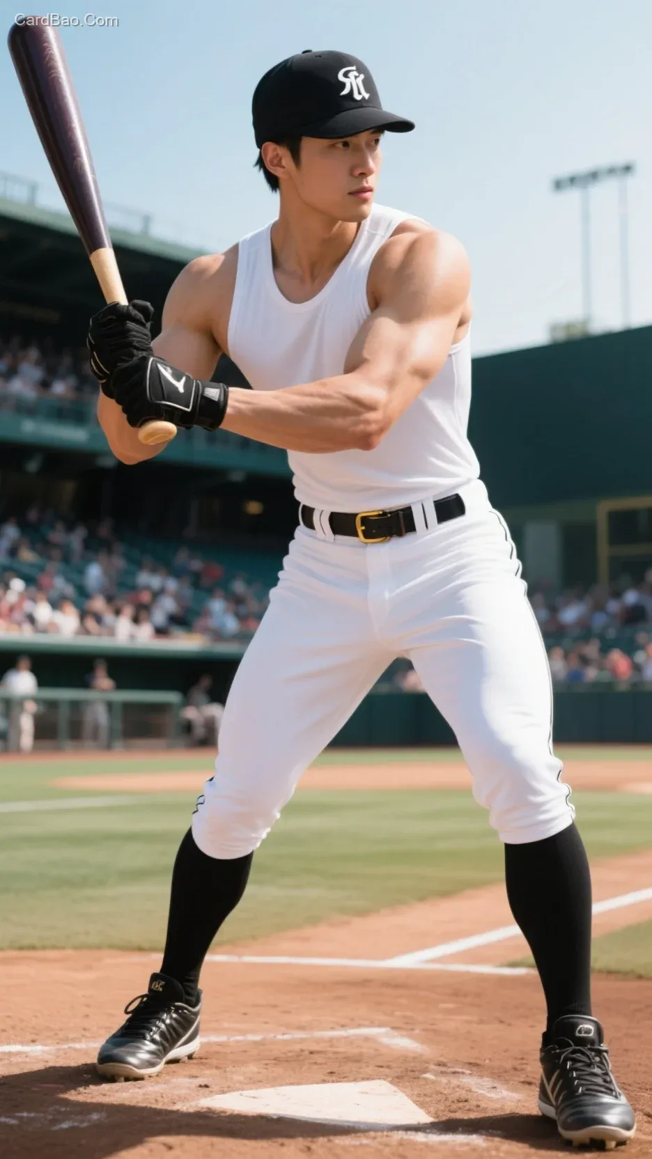 In the baseball field, under the sunlight. A muscular Asian male baseball player with well-defined muscles and a robust physique, wearing a white tight-fitting sleeveless athletic top paired with white tight-fitting baseball pants, with a black belt featuring a gold buckle around his waist. Steel-spiked baseball shoes. He is wearing black baseball gloves, with veins slightly visible on his hands, firmly gripping a dark-colored baseball bat in a ready-to-swing stance. On his head, he wears a black baseball cap with a white team logo. In the background, the blurred figures of spectators in the stands are faintly visible, creating an intense game atmosphere. Emphasize the tension and energy of the game scene. Elongate the leg lines. Long legs. Bulging muscles. Full-body portrait.