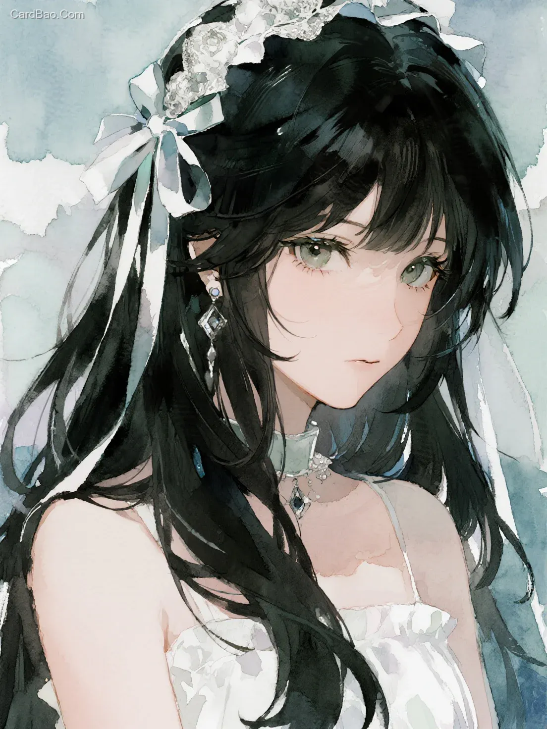 POS,特写,黑色长发女生,白裙,高冷,威严,神秘,冷酷,冷漠,强大。女生华丽丝带发饰