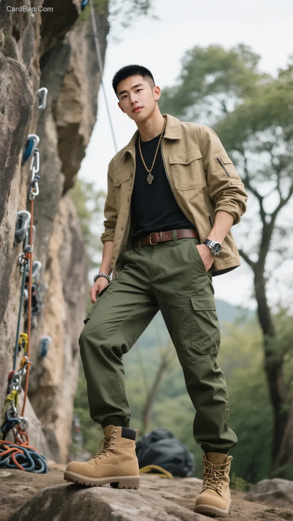 卡其机能夹克配黑T,军绿工装裤塞战术靴,牛皮绳项链、户外表与钛钢手链点缀。