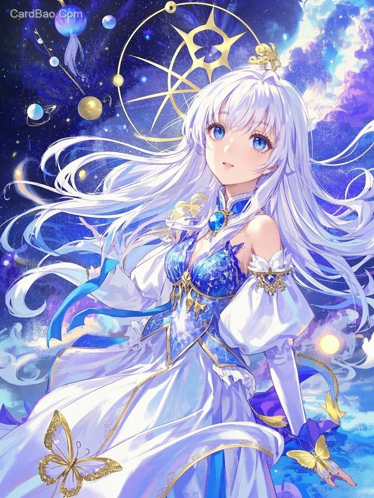 一位绝美的动漫风格少女,长发随风飘逸,发前系着蓝色丝带,大眼睛配上精致的五官。她身穿长款白色纱裙,美腿,泡泡袖装饰着金色花纹和蓝色镶边,胸前点缀着大型蓝色宝石状饰物,身后拖曳着蓝紫色长裙摆。优雅地站立在画面中央,散发着高贵宁静的气质。背景是充满梦幻感的宇宙场景,蓝紫白色的云雾漩涡环绕四周。金色几何图案和符文在她头顶漂浮,形成光环效果。下方展现繁星、行星和星云组成的宇宙奇观,金色蝶形生物在她脚边翩翩飞舞。采用高品质、超精细的动漫绘画风格,营造柔和梦幻的氛围,以蓝、白、金为主色调,呈现出超凡脱俗的神圣感。超高清8K分辨率,构图和谐美观,纱衣,画面采用柔和的淡色调,唯美光影,高分辨率,柔和光,脸部高清,高清画质,杰作,光影交错,暧昧,发烧,意乱情迷。唯美,二次元,现代风格,数字艺术风格,彩铅画,淡雅色调、柔美神秘。8K超清。梦幻,悲伤,忧郁,暧昧,浅色系,近景