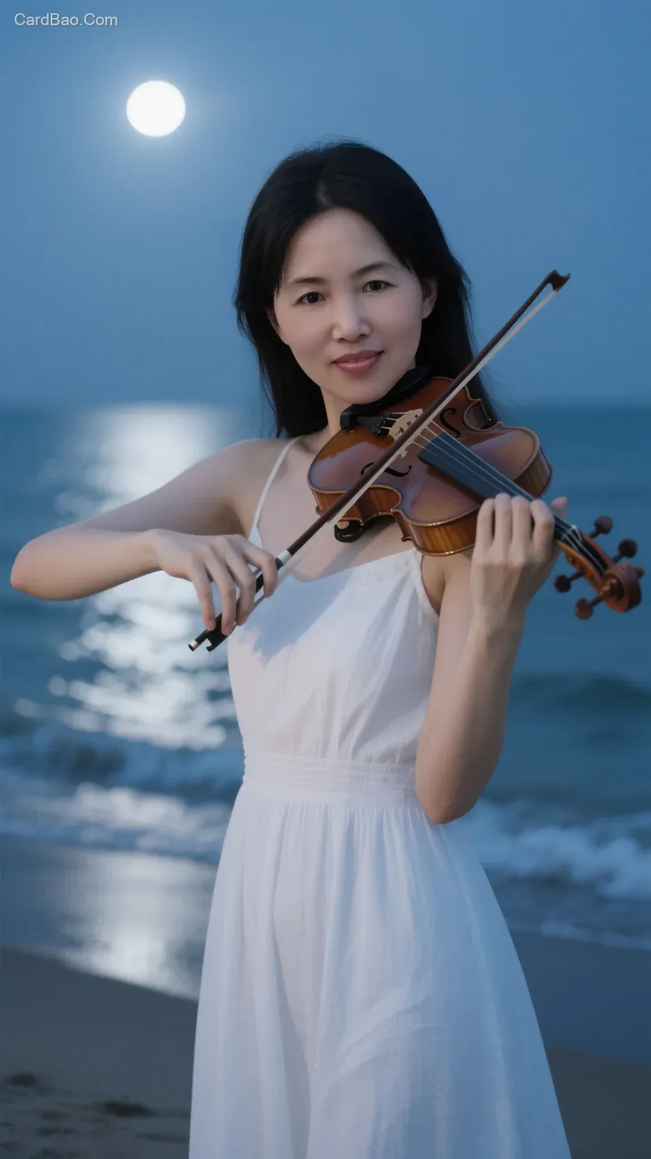 A close-up of a woman in a white dress playing the violin, with an extreme close-up on her head. The background is a night beach, creating a beautiful and poetic atmosphere.