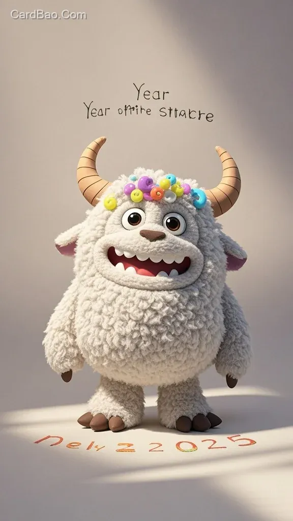 卡通小怪兽IP设计, 3D卡通风格的小怪兽设计,可爱,呆萌,羊毛毡,毛茸茸,古代绝美配色色调,大大的脑袋,头上有两个尖尖的犄角, 嘴巴大大的,眉毛短短,眼睛又大又圆还是白色的,整个形象是拟人化,构图上对称又和谐,用了体积光,背景干净明亮,自然光,高分辨率,细节满满超精致,C4D模型渲染,Octane渲染,3D渲染效果,在Artation、Blender 和 Pinterest 上流行,毛绒玩具,Jellycat 的风格,极小的创意手绘文字 “Year of the Snake 2025” 在画面顶部,文字排版艺术,极简主义,简约高级,杰作,搞笑的,丑萌丑萌的个种搞怪表情更多颜色搭配卷发