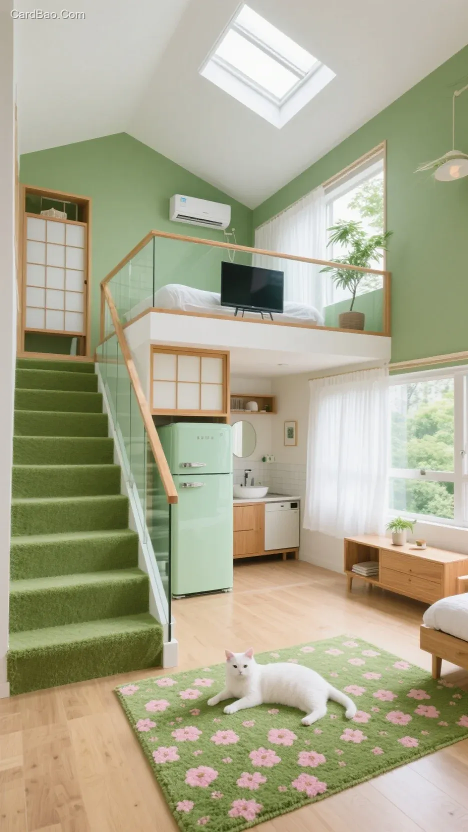 Japanese-style interior, with the TV and air conditioner turned on. A gentle breeze blows through the space. The second floor includes a bedroom, a walk-in closet, and a bathroom, while the first floor features a kitchen and a living room. The staircase should be visible, with a glass railing and a natural wood handrail. The carpet is a thick, plush bean green with pink floral patterns, and the walls are painted in the same bean green hue. The ceiling is white and includes a skylight. A light green refrigerator stands in the kitchen. A cute white kitten is curled up on the carpet. The window curtains are white with small green floral patterns. The second floor has a small balcony, and outside the window, trees can be seen.