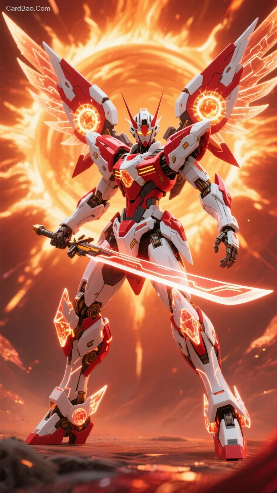人形,光纹高达,超级机器人,幻想系,斩魂者,呈现拔刀出鞘姿势,锋芒毕露,尖锐,中国风,红白色异端高达机甲风格,双重太阳炉能量源,巨大机械翼,手脚关节呈现结晶化