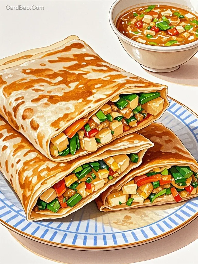 手绘漫画动漫插画,特写天津豆腐菜煎饼,高清,画面干净,精致,还特别有食欲。小资高级