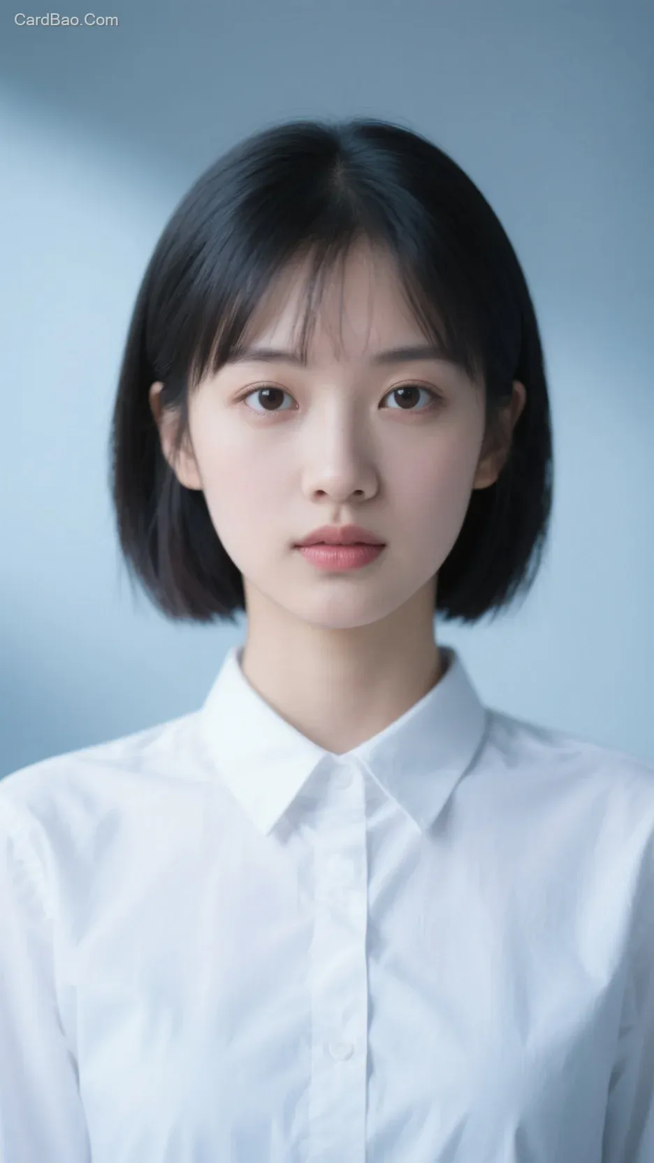 一个靓丽的短发女生,短发整齐,中分,在拍证件照
