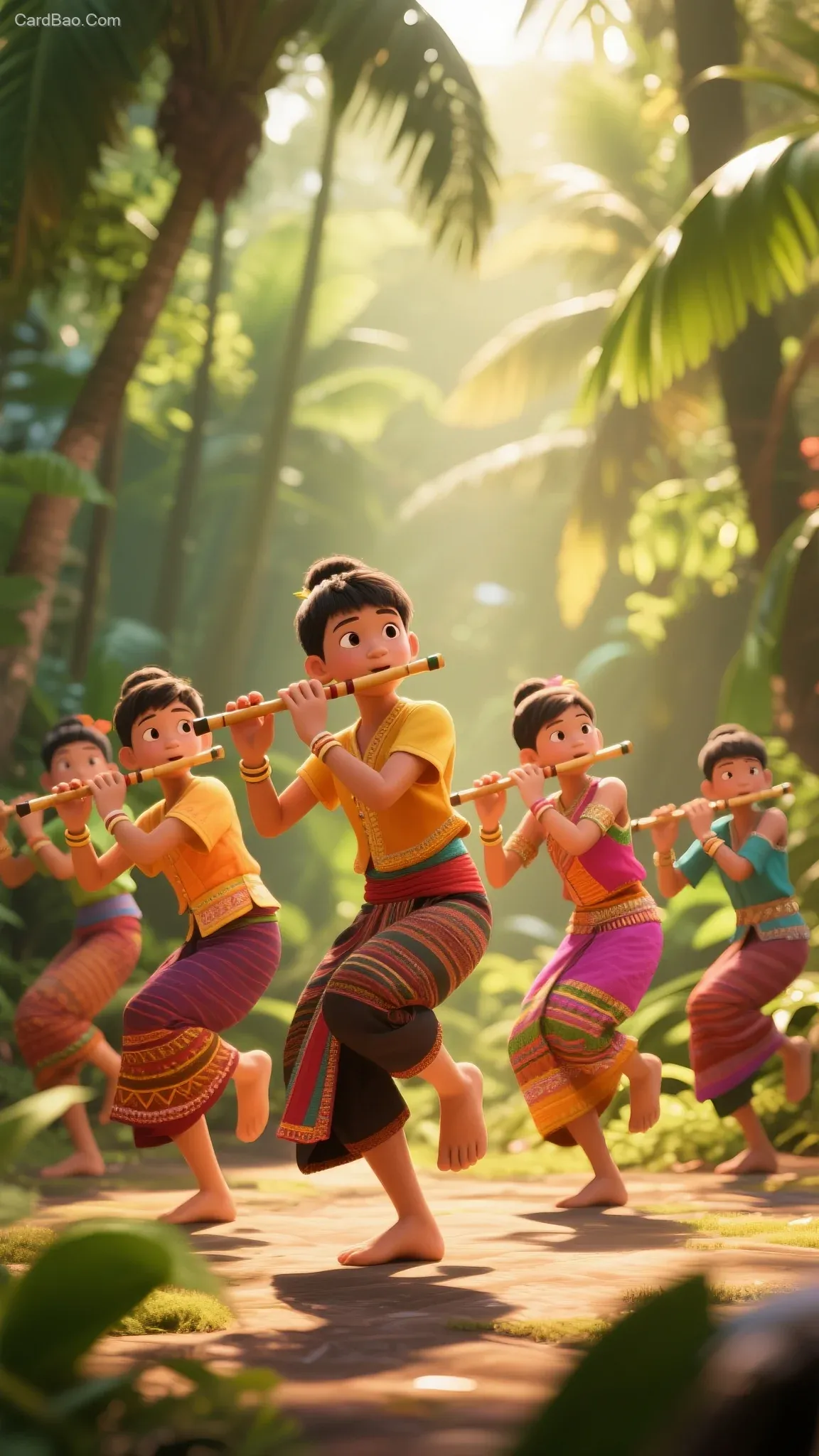 几个3D的傣族少年拿着笛子,吹着笛子,跳着统一的舞蹈,衣服鲜艳,真实请晰,电影般真实,画面影符合罗籍,动作思华,流利,面部真实,动作多,景色美
