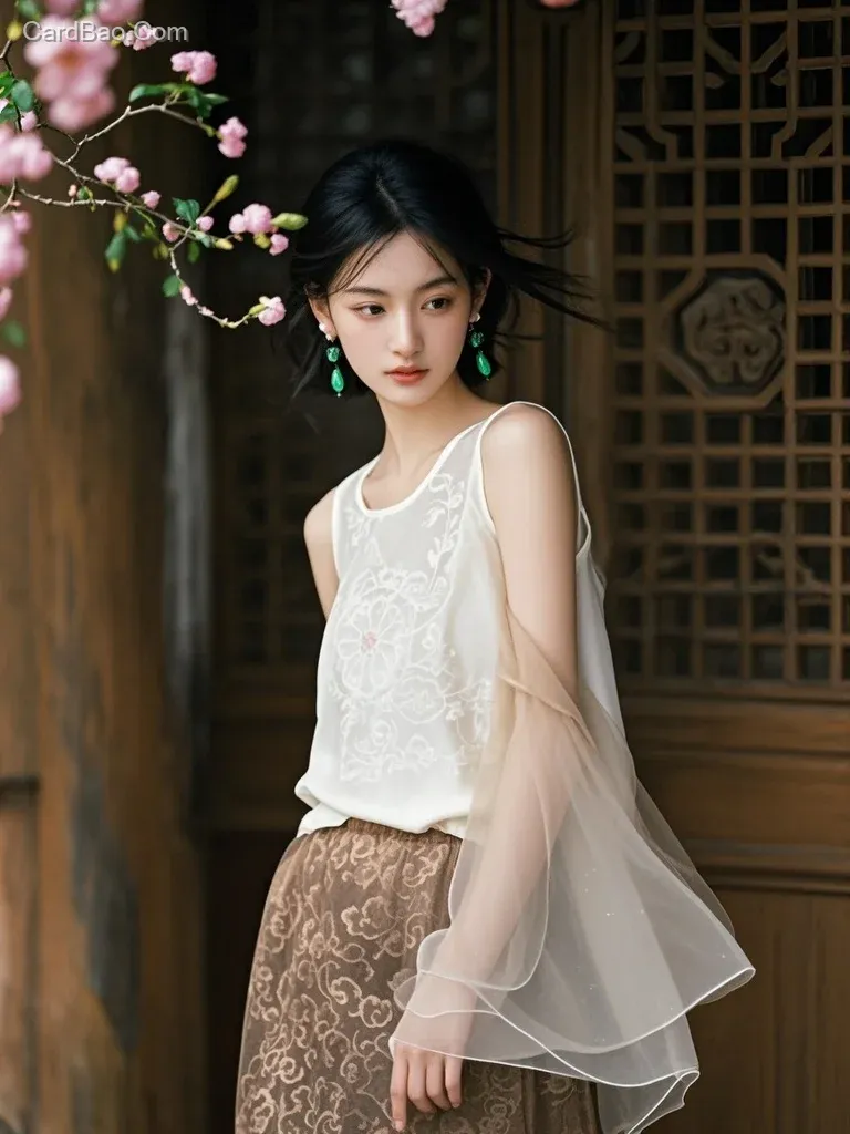 Vague, hazy aesthetics, overall soft blur and diffusion, floral windows, mottled walls, auspicious cloud patterns, medallion patterns, ruyi patterns, abstract, blank spaces, faint and indistinct blurred human figures, motion blur, edge blur, dark tones, multiple exposures, out-of-focus, ultra-wide angle, strong perspective, depth of field, high noise, intense film grain texture, dynamic aesthetics, diffused blur and smudging, exaggerated composition, surrealism, vivid and perfect details, masterpiece, close-up out-of-focus, gaze, eyes, a woman with black hair, holding a branch with pink flowers, wearing a beige sleeveless top and a skirt with patterned irregular hem, paired with light brown sheer lower garment, adorned with green earrings, set against a brown background. The overall style is classical, artistic, and imbued with the charm of Eastern aesthetics.