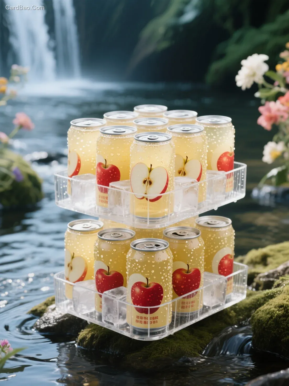 一个透明亚克力篮子里,装着有多罐易拉罐装无糖苹果醋,堆得两层整齐摆放,罐身主体是透明的,罐内液体呈淡黄色,通过透明的罐身可以看到罐内气泡丰富,表面有水珠,显得清凉。罐身有个红苹果的切开细节图案,上面有无糖苹果醋的。整罐饮料看起来很清透。框里还有方形的小冰块,背景是一个小溪流,有花卉,有瀑布,8k,高融合