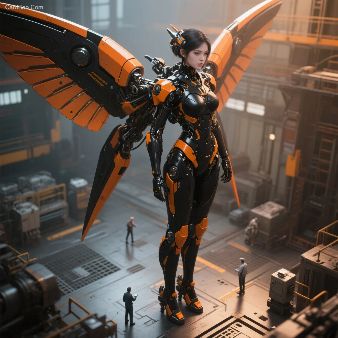 精美的女子面容,包裹在机甲内,高大纤细的机甲躯体。黑色和橙色交织外壳。后背打开巨大长弧形的机械翅膀与机甲躯体完美匹配。俯拍角度。浪漫主义光照。3D逼真效果。机械工厂内景。脚下是小小的人类工程师。