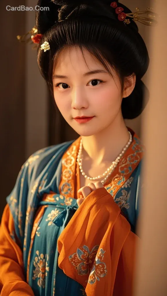 A beautiful woman in Tang Dynasty attire with large eyes and a smile.