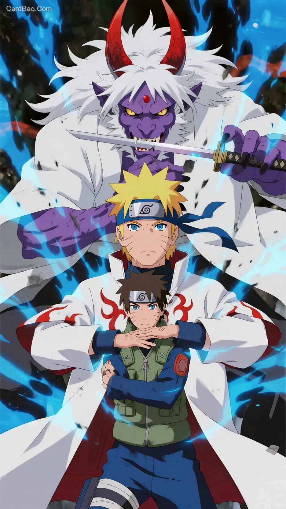 ####3D写实风格的四代火影波风水门,标志性的金色长发飘动根根分明,两侧头发盖过脸颊,刘海向右倾斜露出蓝色忍者护额护额带飘动;深邃的蓝色眼眸闪烁着冷静与锐利,身材高挑,白色火影披风飘动,披风尾部带红色火焰图案,露出蓝色木叶忍服绿色马甲,特写角度,双手合扣结印,背后出现一个巨大的白色长发红色双角紫色皮肤的恶魔,恶魔正面对前方嘴巴咬着剑,恶魔身穿白色大披风,空间扭曲蓝色查克拉粒子环绕身体,超广角低角度仰拍,PBR材质皮肤清晰可见,快速移动的动态模糊的瞬身轨迹,蓝色查克拉能量包裹覆盖全身,多层次景深强化使忍术产生光斑残影,