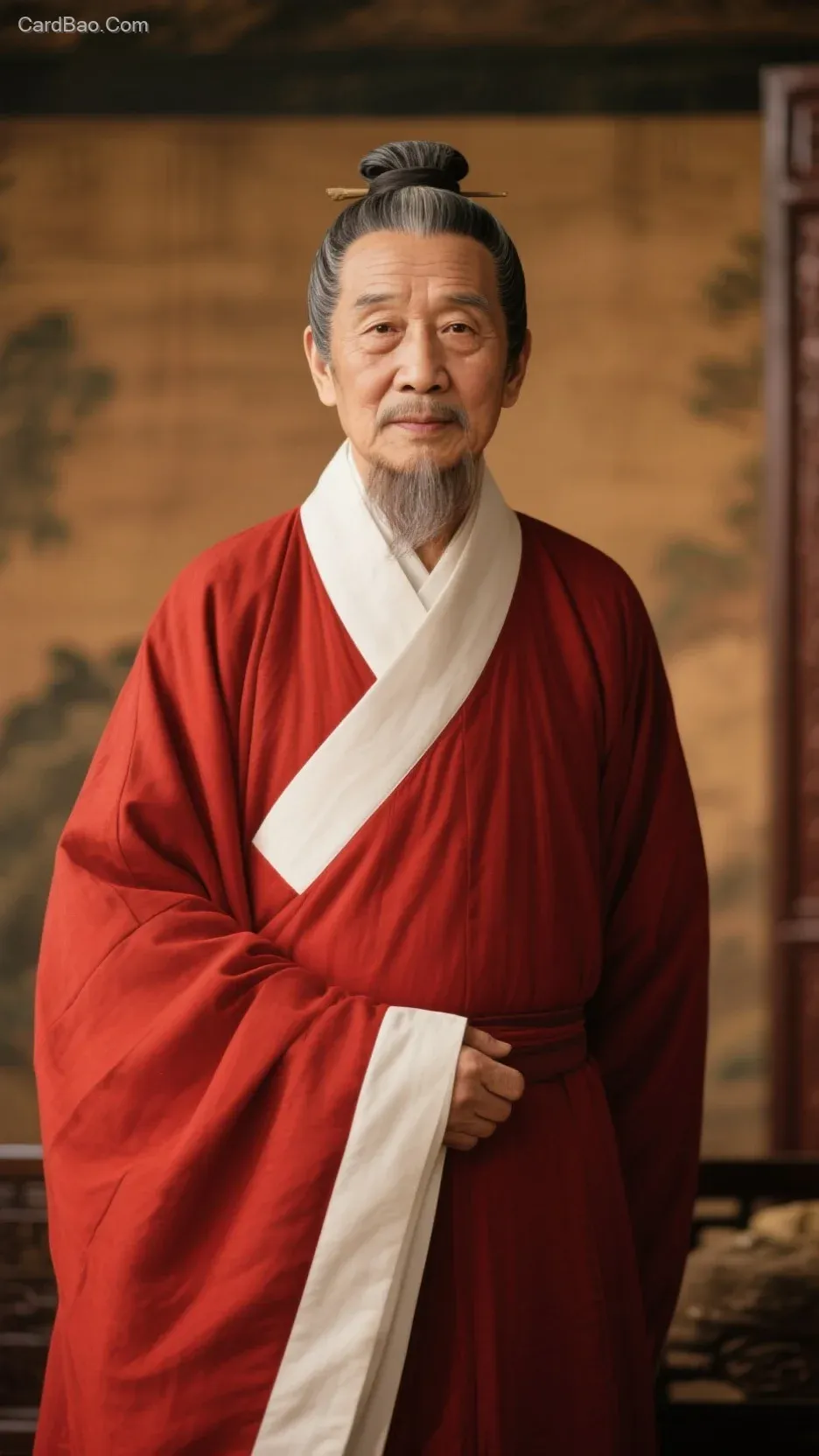 A 60-year-old Ming Dynasty scholar-official, possessing peerless beauty, dressed in a red cross-collared robe with a white inner collar, ultra-high-definition quality, in a photographic portrait style.