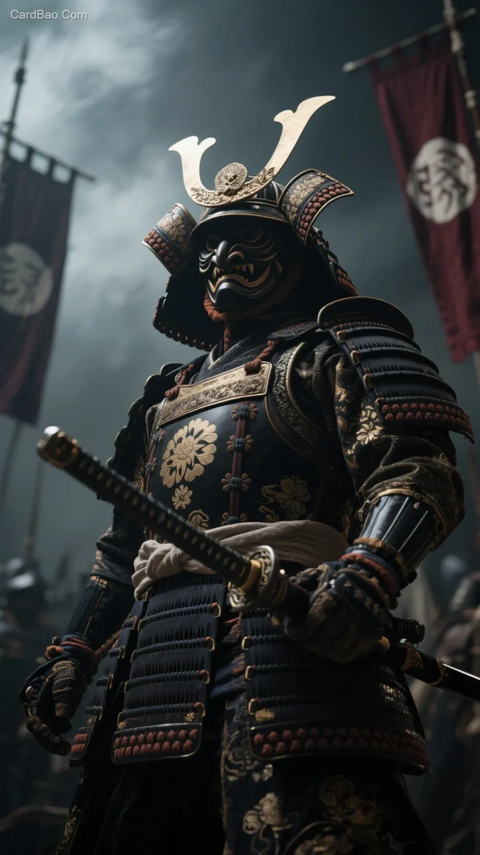 仰视角度德川时期日本武士,甲胄上有家族花纹元素和武士道元素,脸带天狗面具,有日本元素的武器,背景虚化有日式军旗,背景光线阴暗,气氛压抑,vfx写实模式,高清电影质感,8K