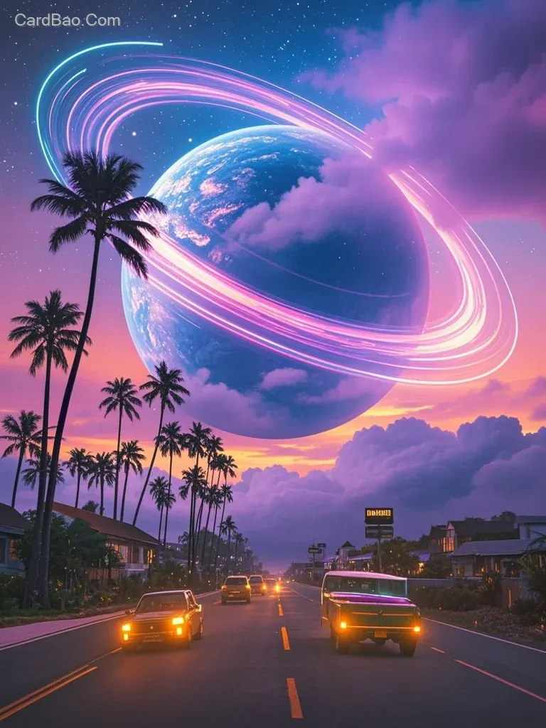 天空中充满了盘旋的新地球仿佛梦幻之境,呈现出充满活力的紫色和蓝色色调,还有明亮的光线条纹,云朵看起来超凡脱俗,形成一个巨大的漩涡状形状,占据了天空,营造出一种令人惊叹的视觉效果,场景设置在一条两旁种着高大棕榈树的街道上方路上有几辆汽车,街道在远处逐渐消失,宁静的街道和强烈的现实的天空之间对比,营造出一种引人注目的几乎是世界末日般却又美丽的气氛。