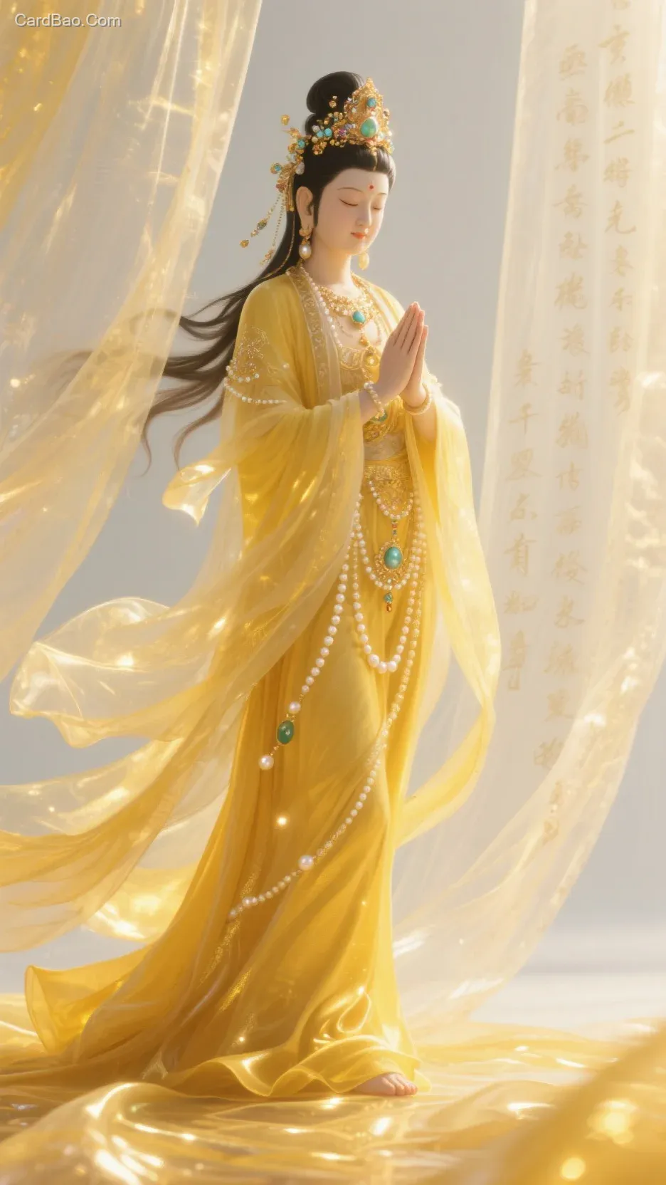 三维古风,黄色丝绸,透明纱幔,发光诗词,诗词在透明的纱幔上,平铺画面,一位菩萨 典雅端庄,威严慈悲,手合十,珍珠玛瑙作为点缀,全身珠光宝气,耍浑身大放光彩,行走在丝绢上,,发光丝绢,无限想象力,幻雾感,折射阳光,菩萨全身大放光彩,光宝气缠绕全身,头戴珠宝,威严端庄,霸气慈悲,裙摆飞扬,长发飘飘,大面积留白,高清