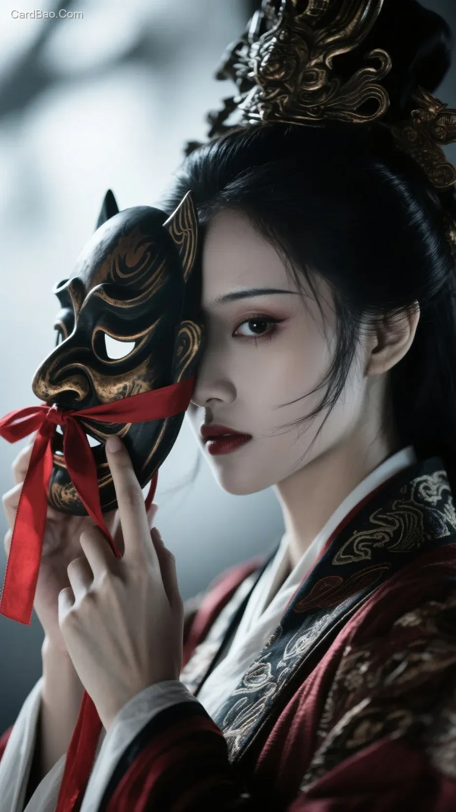 古代祭司,傩舞,带有红丝带的面具,手持面具半遮面,脸颊有两弯碎发,中式古典美人,黄金比例的五官,具有辨识度的五官,鹅蛋脸,丹凤眼