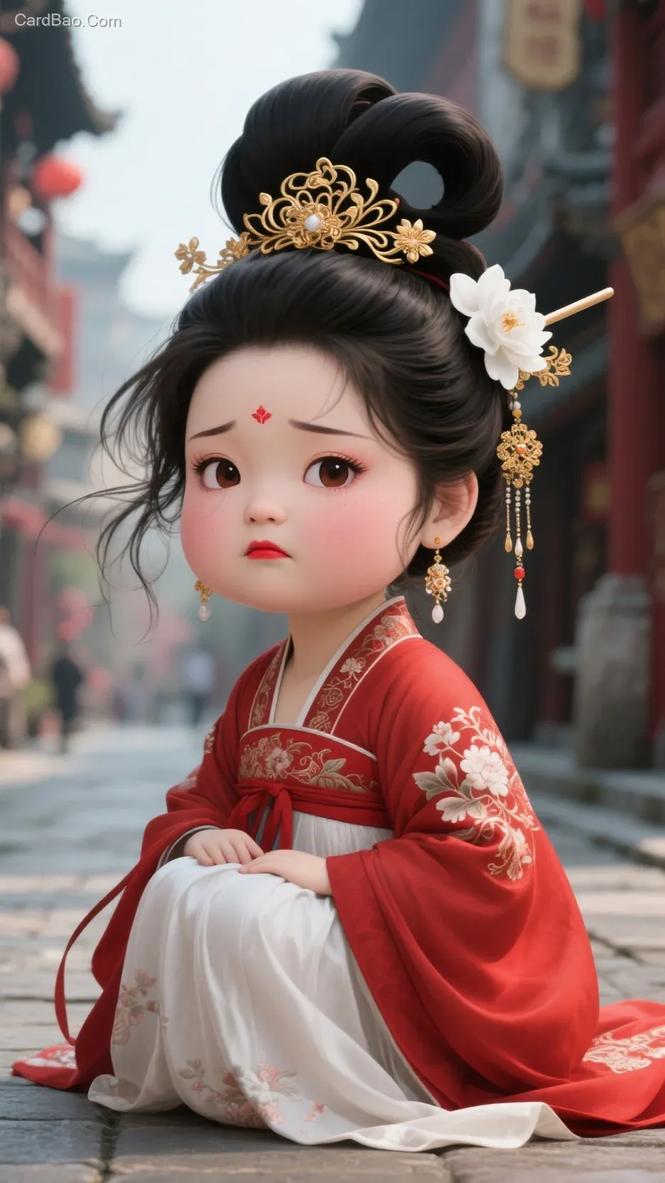 她佩戴着一对精美的耳饰,,与整体造型相得益彰。身着红色传统汉服,白色裙身,饰有精致花纹,衣服褶皱,头发凌乱,坐在大街上