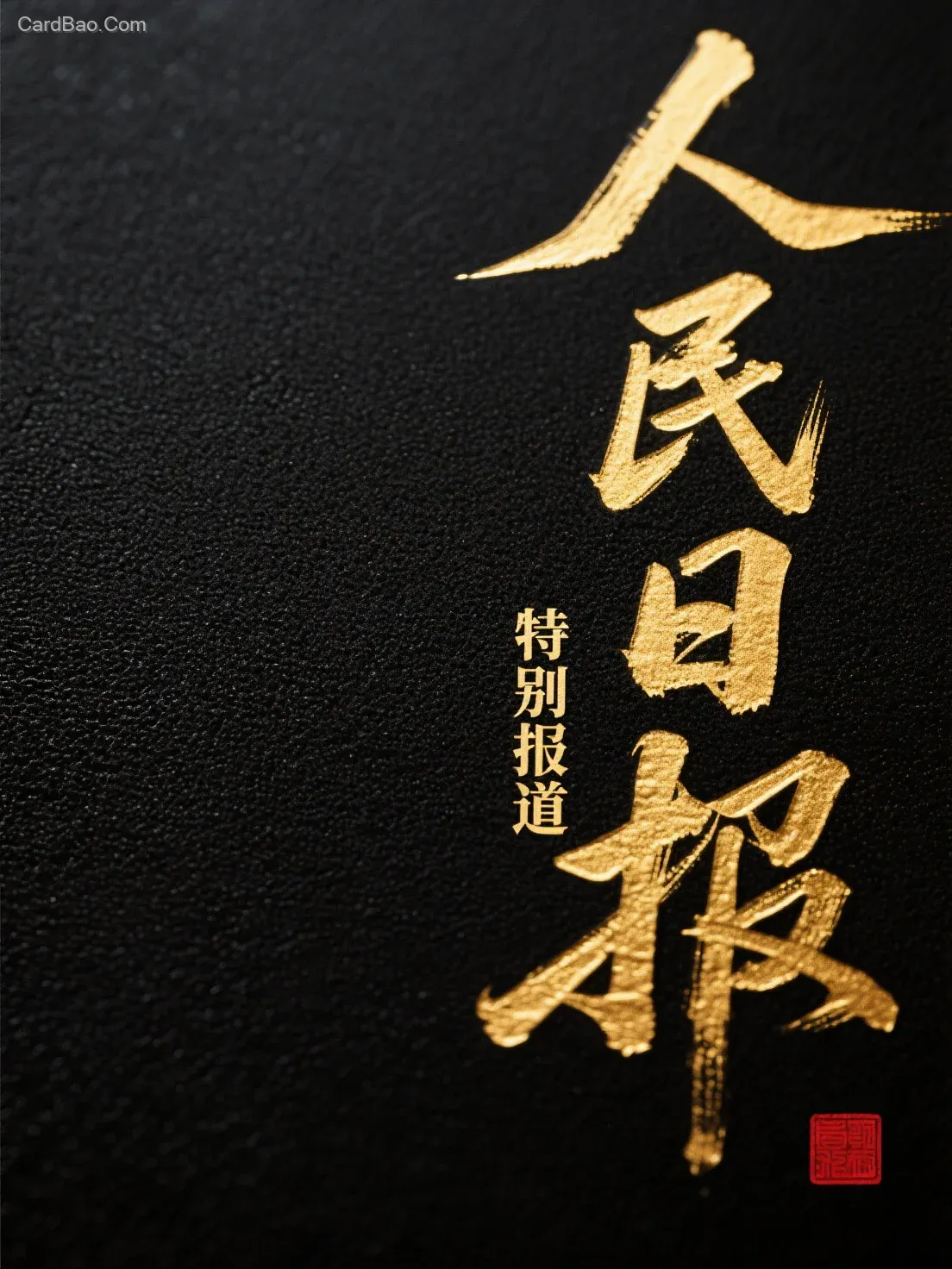 Calligraphy Poster Creative Work: A solid matte fine-grained textured background. On the right side of the image, vertically flying and free-spirited handwritten gilded large characters read "People's Daily," with smaller text "Special Report." The design features an engraved etching effect, a sharp knife-cut style, distinct edges, an inwardly recessed style, and a deeply indented effect. The font is bold, powerful, and handwritten, resembling the work of a calligrapher. In the lower right corner of the text, there is a very small square red seal.