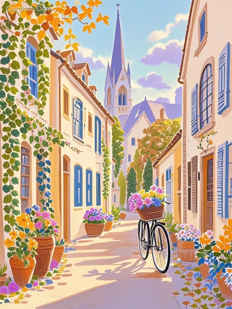 小径两侧是色彩柔和的欧式建筑,墙面主要用米色、浅黄色和淡橙色绘制,窗户和门框用深蓝色和深棕色勾勒,体现出建筑的立体感。建筑的墙面上爬满了绿色的藤蔓植物,用深浅不同的绿色彩铅表现叶片的层次,部分叶片用黄绿色突出受光面。街道上有一辆复古的自行车,用深蓝色和黑色描绘车身,车篮里放置着一束鲜花,用与前景花朵相呼应的色彩绘制。
