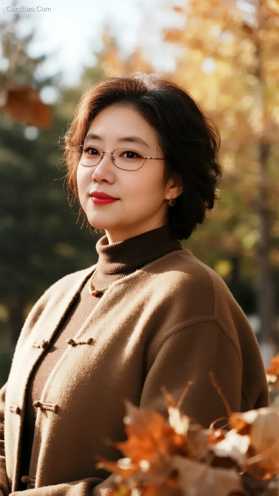 ##50岁妈妈,气质美女。妆容精致,秋天搭配,新中式暖色调,最佳配色,秋天背景,高清画质