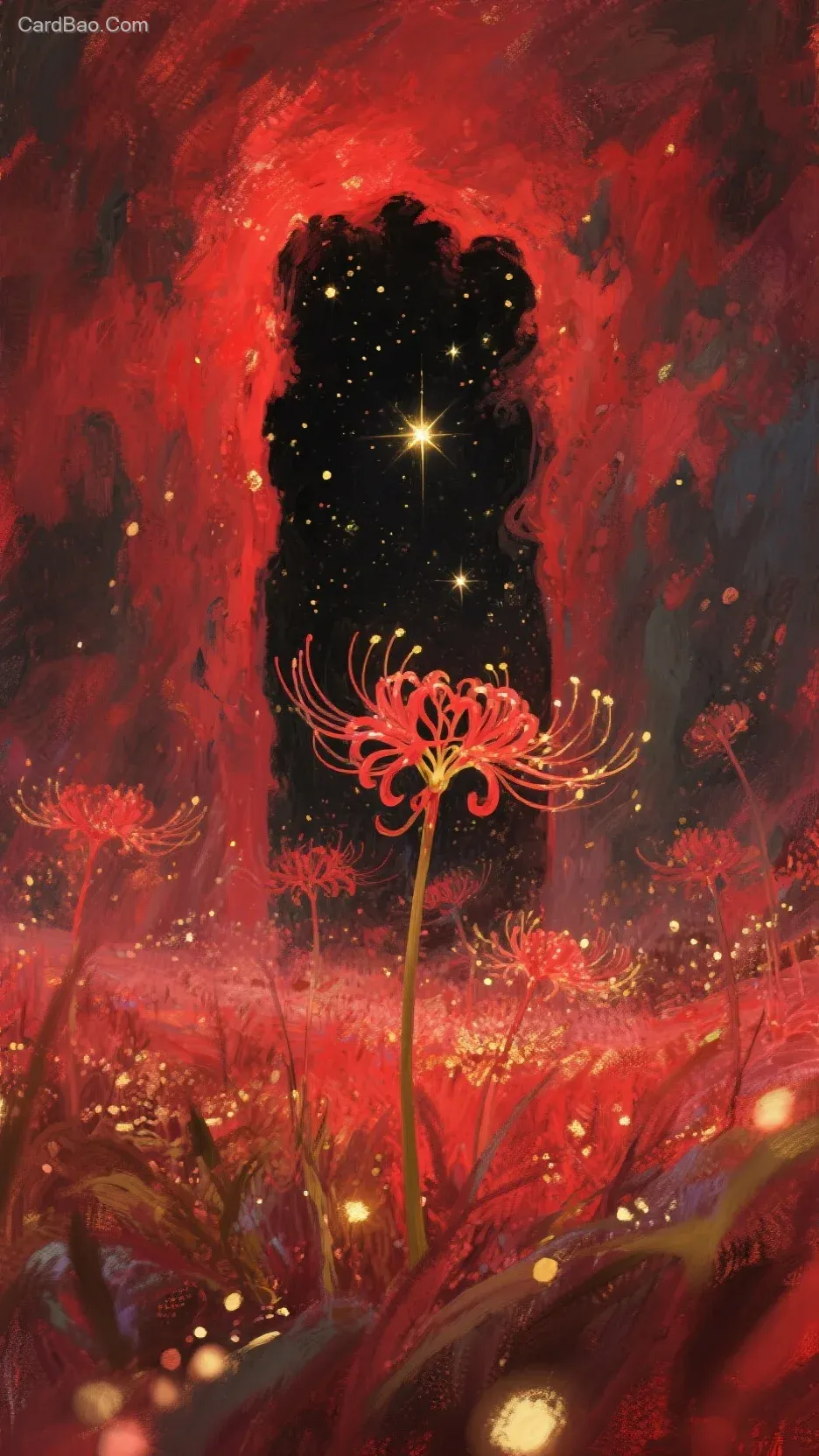 Using loose brushstrokes and blending techniques, create with oil and acrylic paints. A glowing sea of stars, the gates of hell, red spider lilies, scattered starlight, linear highlights, granular glow, and a sense of gloss. Weaken the precise contours of objects, using gentle smudging to create a hazy atmosphere. Capture the impressionist approach to light, shadow, and color ambiance, emphasizing the poetic expression of the overall mood. Use red as the main tone to build a dreamy foundation, with soft and elegant hues blending warm and cool tones. Black, red, and gold create a warm, ethereal visual effect, conveying the tranquil beauty of nature. The forms are impressionistic, not pursuing detailed realism. Use blurred shapes to show layers, suggesting the presence of objects through color and light, focusing on building the scene's atmosphere and giving the image room for imagination, highlighting the liveliness and vitality of natural scenery.