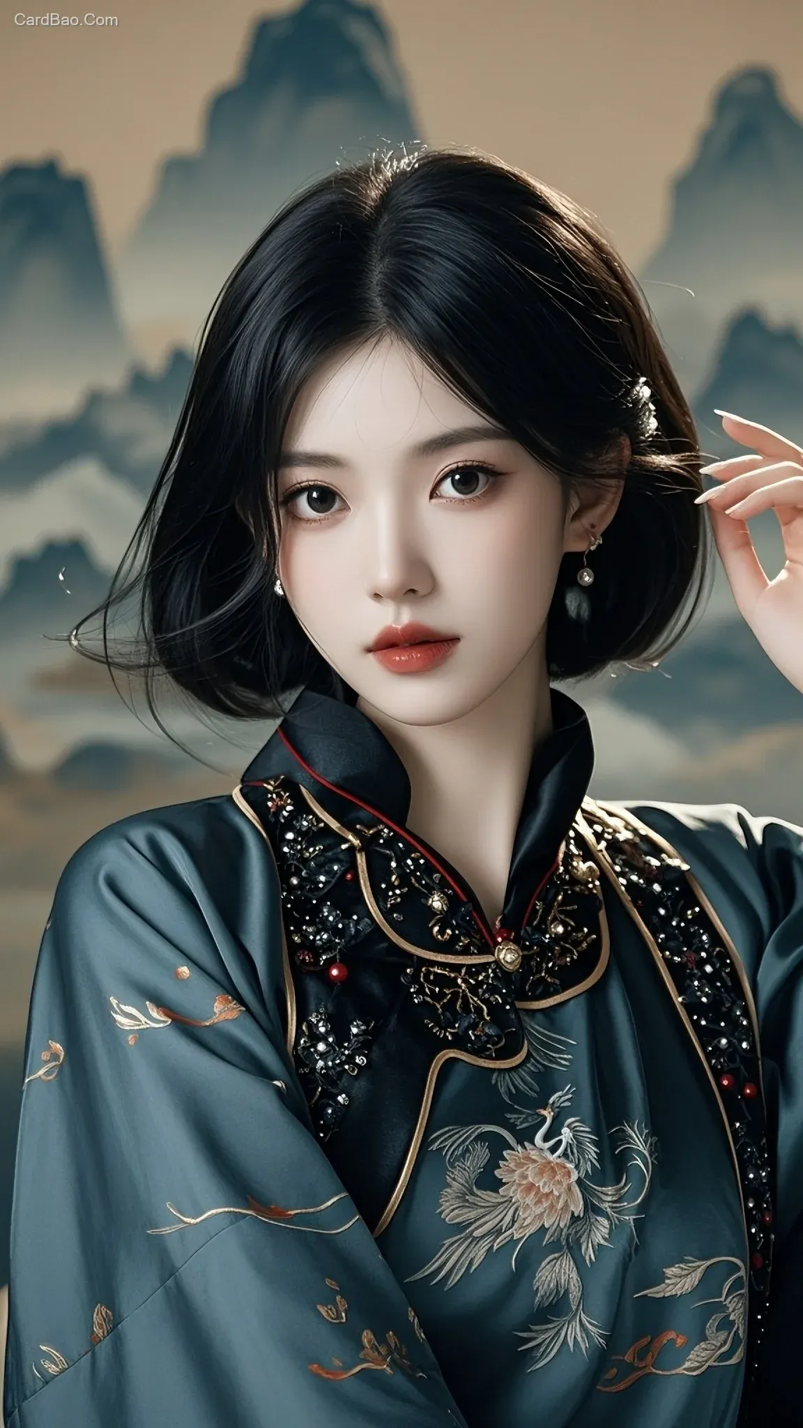 Professional medium-long shot, Chinese beauty, jet-black short hair, exquisite facial features, bright large eyes, coldly elegant and graceful, a peerless beauty, dressed in exquisite silk attire, showcasing an elegant posture, flawless fair skin, 3D rendering technology, 32K ultra-high-definition resolution, professional photographic lighting, grand composition, full-frame sharp focus, achieving a 32K wallpaper-level texture.