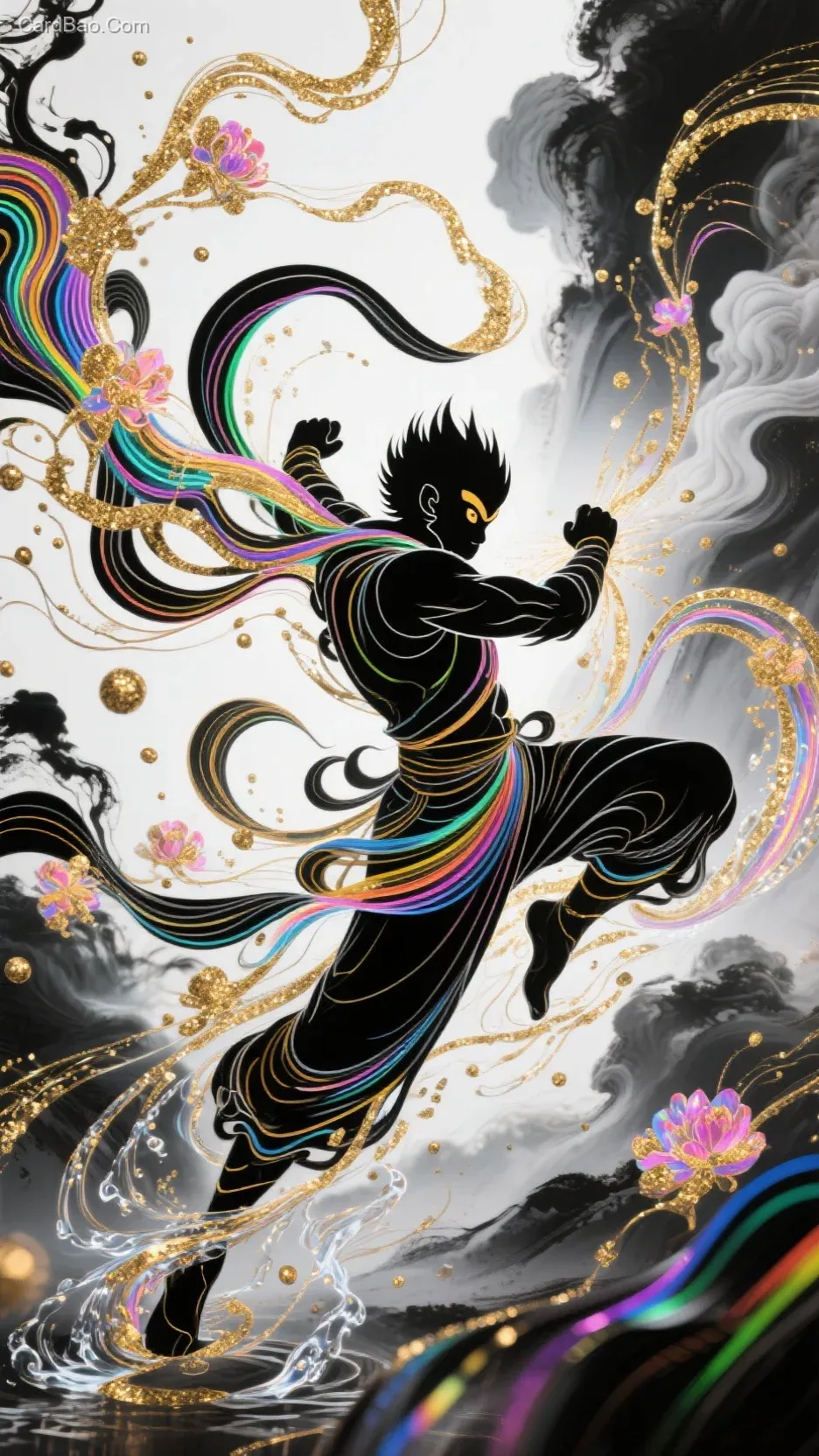 数字文化科技幻想,黑白轮廓和七色光线条缠绕变形拼凑生成一副大家画作,洒脱奔放,似线描似流水潺潺,勾勒出花彩,金丝缠绕,粒子波动放光,拉长变形如流水波动,总有一种梦幻脱颖而出,画中藏着玄妙,似有幻影重现,暗藏着悟空打斗,随云烟一起飘动,令人无限遐思,想无可想,海阔天空,似梦似幻,与环境融为一体