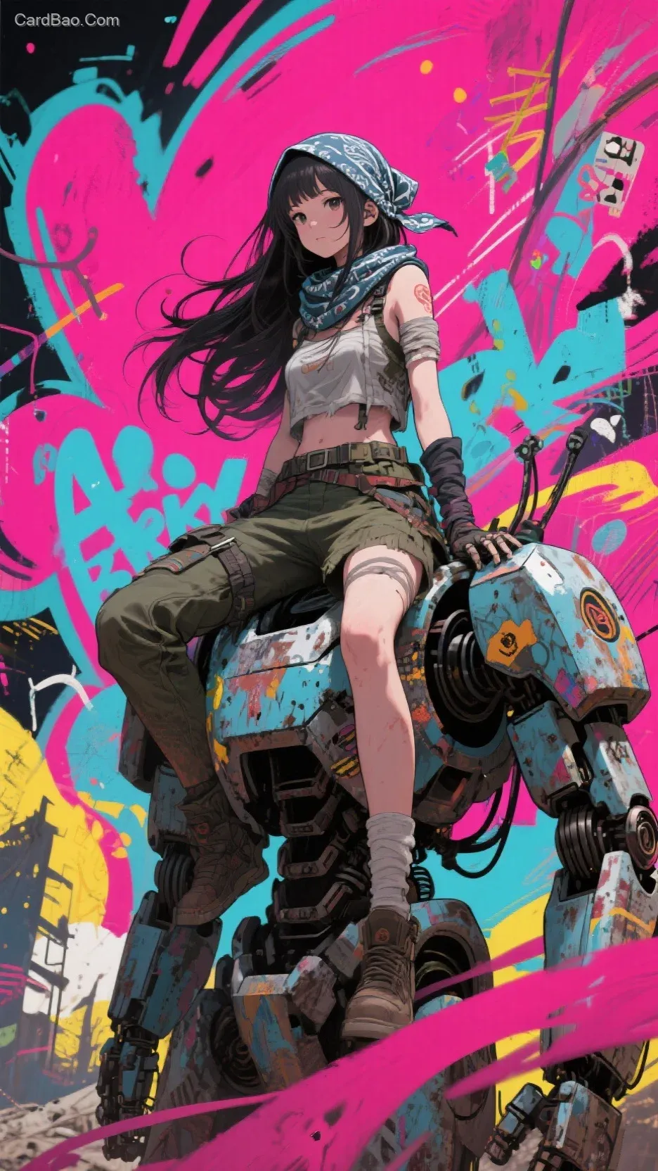 虚幻5引擎打造,Acky Bright风格,涂鸦线条飘逸装饰元素点缀。画面抽象与前卫潮流元素碰撞,天野喜孝的艺术特征,画面没有文字元素。一个戴着废土风头巾的长发少女穿著廢士服装坐巨大的机器人肩膀上