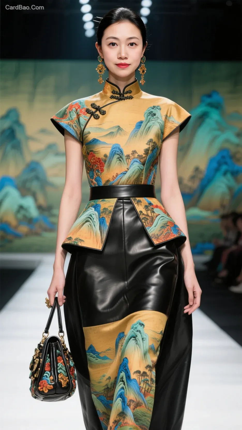 ## Runway Show, Oriental Beauty. Chinese Model. Wearing an elegant haute couture eco-friendly leather skirt set with an embroidered "A Thousand Li of Rivers and Mountains" pattern, paired with a trendy fashion bag. Featuring three-dimensional tailoring. Filled with trendy elements, a sense of fashion-forward style, and confidence in leading fashion trends. Showcasing the overall outfit, highlighting the sense of trendiness, with rich and vibrant colors, full of modern fashion vibes. Creative use of light and shadow, Chinese chic, portrait photography, and visual art photography with a Zen-inspired touch. Expressed through high-purity color combinations to reflect the model's emotions, along with light and shadow art (complex lighting, the model enveloped in light and shadow), creating a hazy, dreamlike atmosphere. Three-dimensional tailoring with exaggerated and intricate accessories to accentuate the beauty of the form, with flowing garments. High-end design sense, the model presenting a frontal view, set against a modern high-end runway design scene with the "A Thousand Li of Rivers and Mountains" as the backdrop. Fashion-forward, mysterious, and profound. International art fashion exhibition, highly artistic modern design composition, Italian-style portrait photography, masterpiece-level work. Full-body shot, a masterpiece, award-winning work.