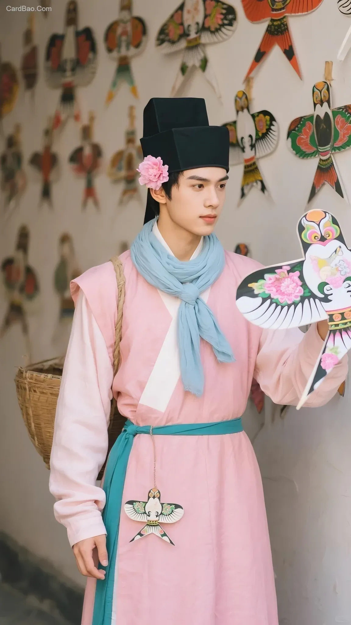 古风,一个年轻货郎,头戴黑色方巾帽,耳畔戴着一朵粉色簪花,身穿一件粉色交领半臂长衫,内搭浅粉色长袖,脖子上戴着一条淡蓝色围巾在领口处打结,腰上系着一条青色腰带,腰带上挂着一只小纸鸢,手上拿着一只大纸鸢,背景墙上挂满了大大小小的纸鸢,真人