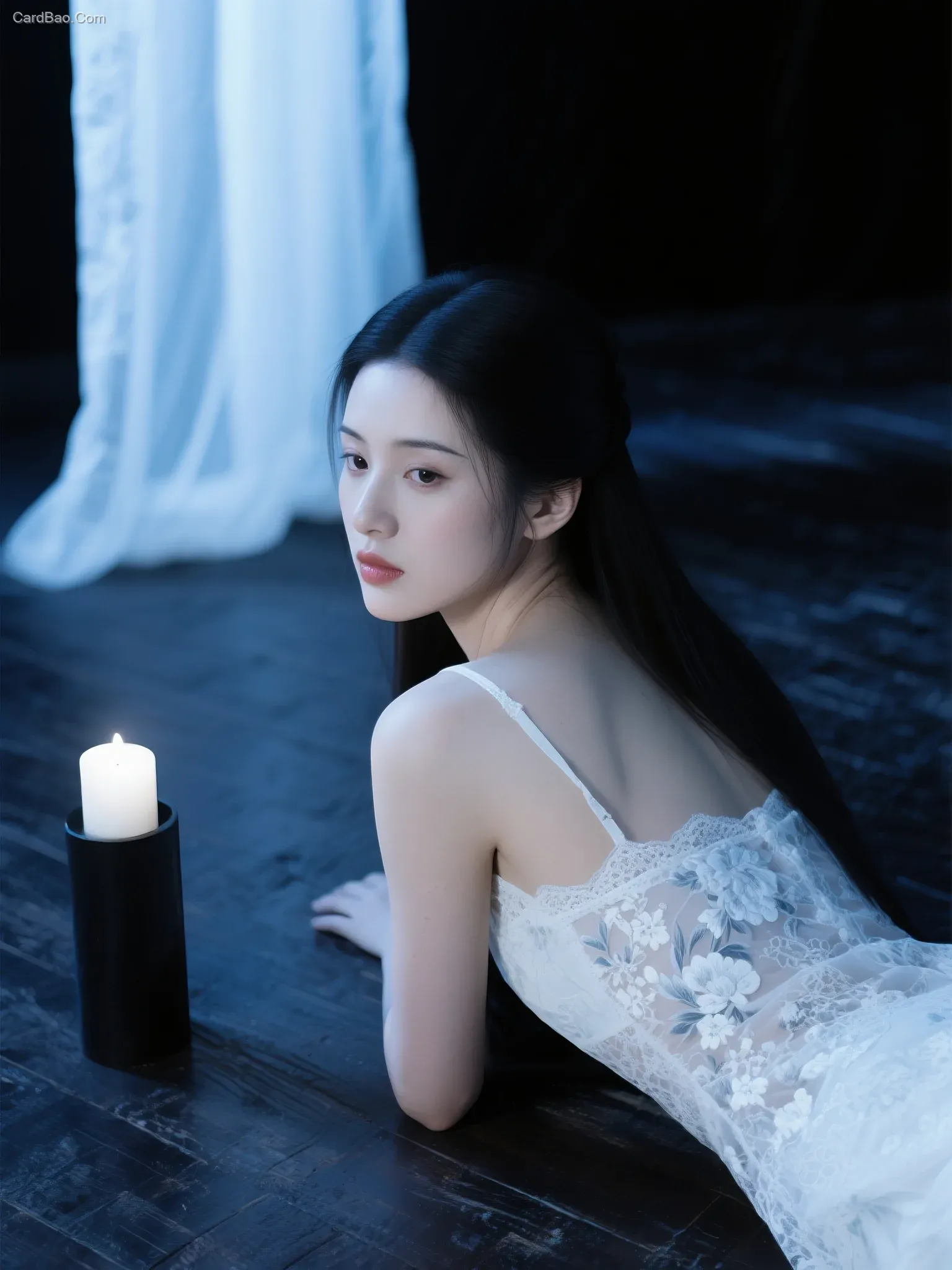 背景光线昏暗,营造出一种富有情调的氛围。画面左侧,黑色圆柱形小烛台上点燃着一支白色蜡烛,为场景增添了温暖的光晕。背景中,白色薄纱窗帘轻轻飘动,进一步烘托出空灵的意境。整体色调以白、蓝、黑等冷色系为主,强化了照片如梦似幻、近乎超凡脱俗的感觉。蕾丝的纹理与女性肌肤的光滑,和地板的粗糙形成对比,为画面增添了深度与层次感。