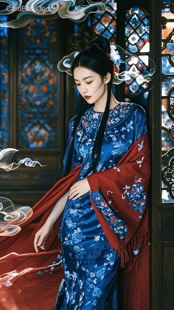 Construct a chaotic dream of intertwined reality and illusion through multiple exposures, using high-purity contrasting colors (such as indigo and crimson) to create a hazy atmosphere. The subject wears a fitted long dress and an embroidered shawl, appearing intermittently amidst motion blur and out-of-focus light and shadow. Eastern patterns (such as lattice windows, intertwining vines, and auspicious clouds) float like fragments. Asymmetrical compositions disrupt balance, while complex lighting cuts through the space, forming a hazy dream within a dream. The overall aesthetic is minimalist yet richly layered, showcasing a woman’s noble and profound emotions between the bizarre and the elegant. Close-up shot, high definition.