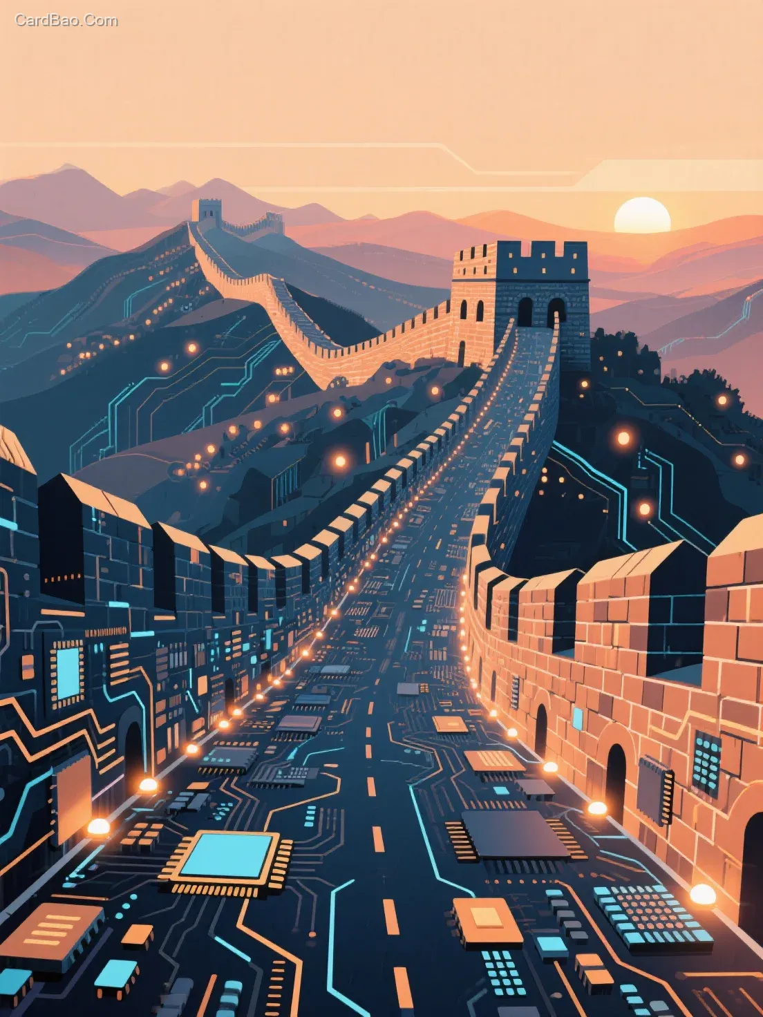 海报,电路板、芯片全部包裹着的长城,城墙是芯片,道路是线路板,延伸到远景,日出,电子元件LED灯光装饰,起伏蜿蜒,科技,科幻,大胆,梦想,32K,科技感 未来感