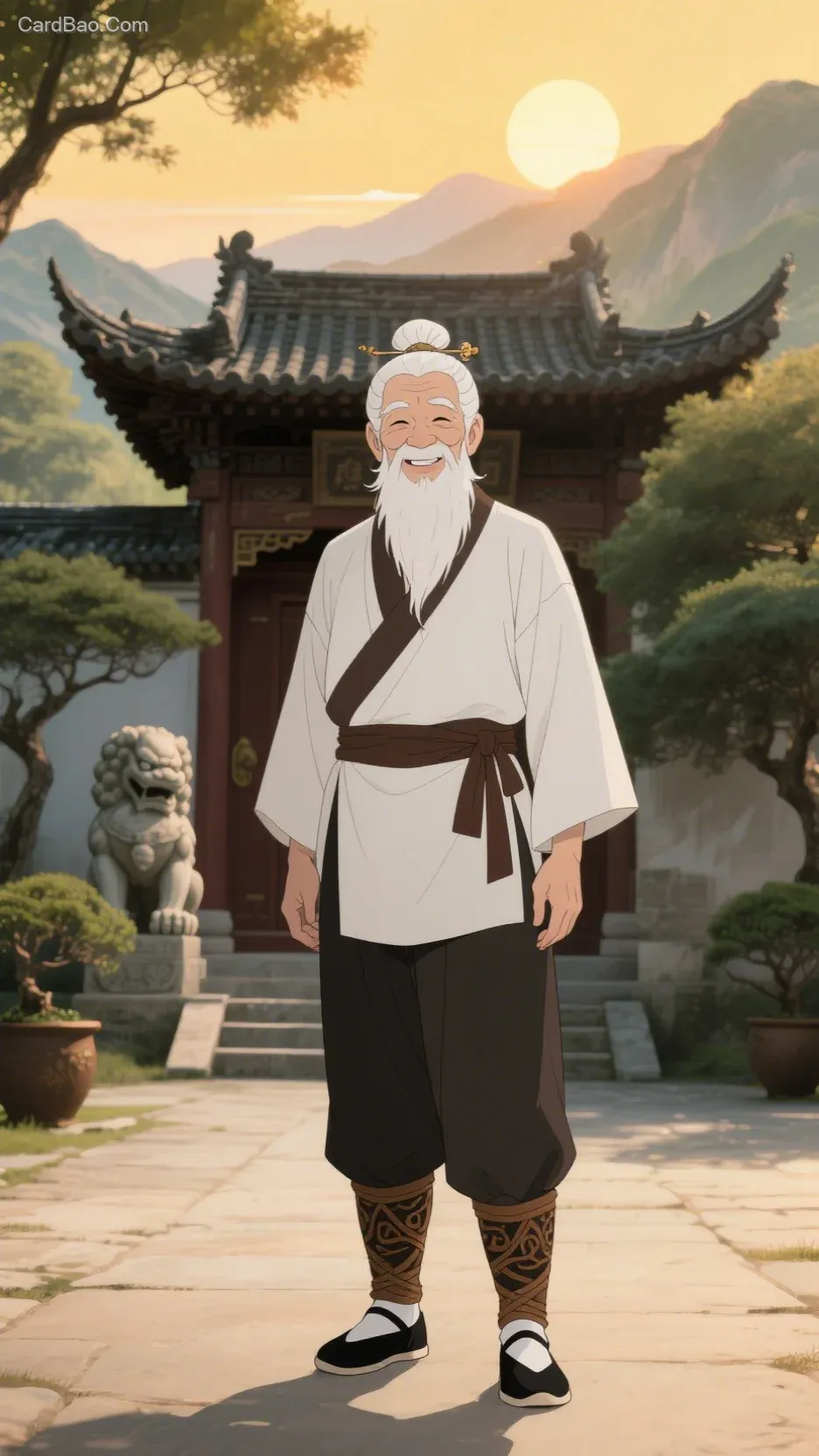 一位古风老人,白发束于头顶,插有发簪,面容微笑,长白胡须垂至胸前;身着白色上衣,,腰间系深棕色束带,下身搭配深色长裤,裤脚挽起,露出带有复杂纹路的棕色绑腿,足蹬黑白色传统布鞋,双手自然垂放身体两侧,