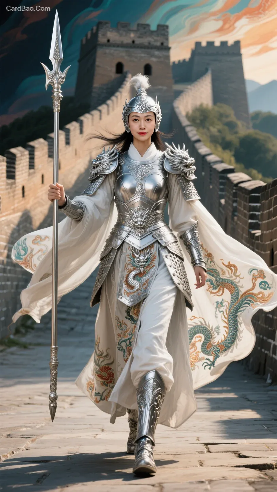 ## Runway show, featuring an Eastern beauty. Full-body image of Zhao Yun in shining silver armor, wielding a Dragon's Courage Silver Spear. The spear has a silver shaft with an ornate, long, and sharp tip, adorned with embossed dragon patterns. A glass-like texture with a casual highlight stroke. High detail, high clarity. Rembrandt lighting focused on the face to enhance the contrast of light and shadow, emphasizing the visual tension of broad brushstrokes on the face. Low-angle perspective. A sense of paint application and texture, with bold, sweeping brushstrokes. Modern expressionist brushwork, with a palette knife creating thick, textured layers. Slight reflection from pigment particles. Contrast between warm and cool colors: warm colors are raised and thickly applied for a tactile feel, while cool colors are thin and blurred. Enhanced artistic atmosphere. The figure below the shoulders is loosely sketched. Oil paint. Natural transitions of dim light and shadow around the edges. Most of the canvas appears unfinished, with coarse linen texture visible. Dark-themed. Unconventional composition with strong perspective, breaking traditional norms. Clear theme with a captivating focal point. Strong visual impact that resonates with viewers. Helmet, armor, national trend-style clothing, war robe, an embroidered large cloak fluttering in the wind, combat boots. Masterful composition, full of emotional atmosphere, high contrast, emphasizing the fusion of texture and light and shadow. Dynamic, dreamy, wide-angle, depth of field. New art style, surrealism, rich details, vivid and perfect colors. Masterpiece. The Great Wall, with interwoven light and shadow showcasing majesty and solemnity. Embodies physical beauty, three-dimensional embroidery, tailored structure, loose silhouette. Flowing garments. Dunhuang color palette: rich, high saturation, strong visual contrast. Cinematic blockbuster feel,反差 (contrast), visual impact, hyper-realistic, chiaroscuro,高级 (premium), elegant, romantic. Full-body frontal shot,高级设计感 (premium design sense), model presenting frontally. International art fashion exhibition,时尚舞台 (fashion stage), T-stage design setting,神秘深邃 (mysterious and profound). Highly artistic compositional form, Italian-style portrait photography, masterpiece work. Full-body shot,杰作 (masterpiece), award-winning work.