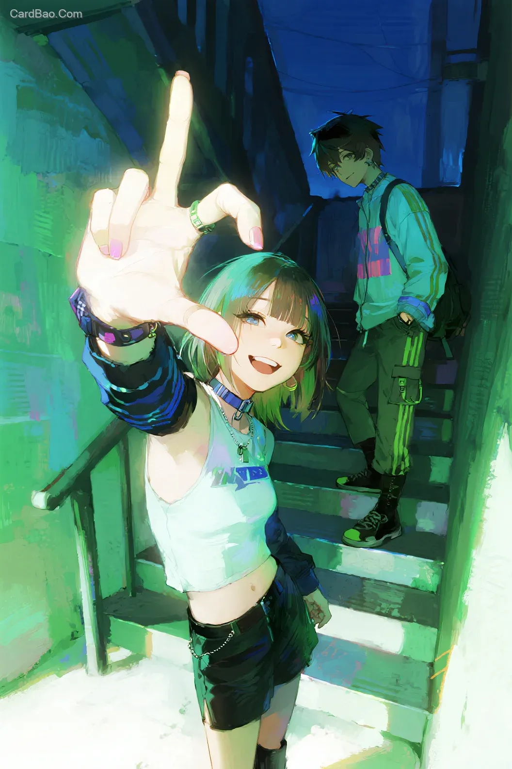 2d,丙烯,超越时代,虚实反复穿插,耀变,笔触感,少边界感,高饱和度,加强颜料的涂抹感,肌理感,手绘感,艺术,梦幻绿光,蓝调时刻,楼梯,街头少女和少年,抬起过曝的右手比出OK手势,挡镜头,嬉笑,高接机能风,个性,细节丰富
