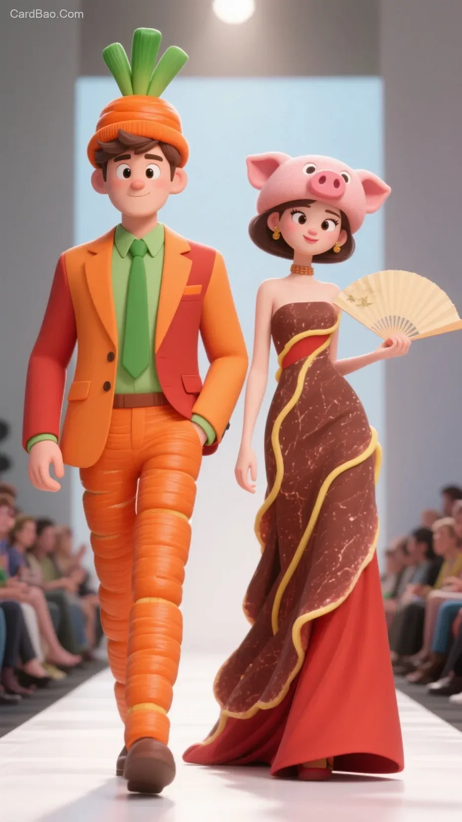 卡通帅哥身着橙色胡萝卜段拼接的休闲西装,搭配绿色胡萝卜缨制成的领带,头戴胡萝卜形状的帽子。卡通美女穿着红褐色猪肝片拼接的拖地长裙,裙摆用浅黄色猪肝筋点缀,手持猪肝图案的扇子,尽显妩媚。他们在白色光铺满的白色高端T台走秀,T台两侧观众认真欣赏,白色背景尽显素雅。3D漫画卡通风格,超清大景深,拟人化,模糊背景观众席。