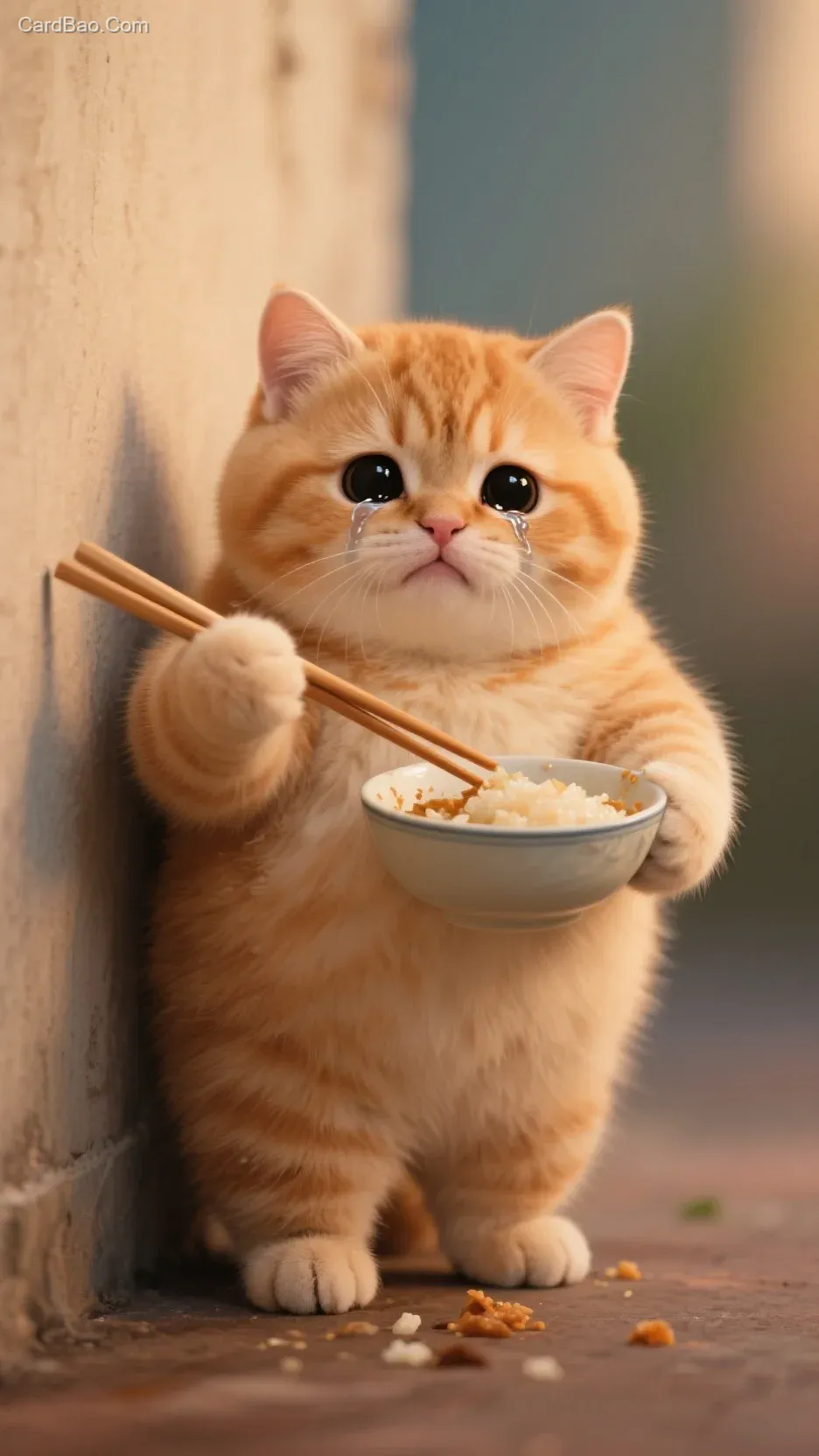 一只胖胖的,幼崽橘猫,两脚笔直站着,靠着墙,右手拿着一双筷子,左手拿着碗,碗几还有剩饭,留着眼泪,很伤心,大大的黑色眼睛,背景虚晃