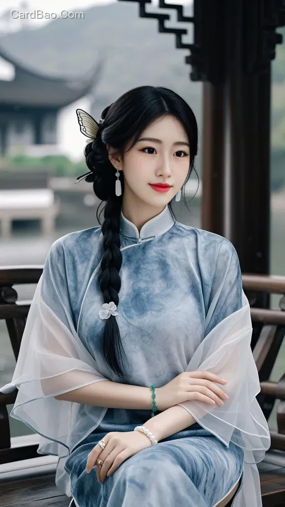 ##绝世佳人,盛世容颜,身着意境悠远的水墨风真丝旗袍。极致高清画质,蓝光级锐利细节,32K超分辨率。佳人仪态万方:上半头乌黑秀发精巧编成蝶翼状发髻,以一枚温润羊脂白玉簪别起;下半秀发如瀑自然垂落肩头。耳畔点缀玲珑翡翠耳坠,腕间佩纤巧白玉手镯,更显冰肌玉骨。旗袍剪裁极尽优雅,垂坠感完美勾勒出亭匀体态,修长脖颈与纤细手指更添精致。面容秀丽绝伦,气质高雅空灵,眉眼含笑,温婉中透出古典神韵。采用高清中远景半身像构图,背景为朦胧烟雨江南庭院,画面弥漫高级绢本设色质感,电影级柔焦光影氤氲流转,氛围静谧诗意,将东方水墨意境与绝世风华凝于一瞬